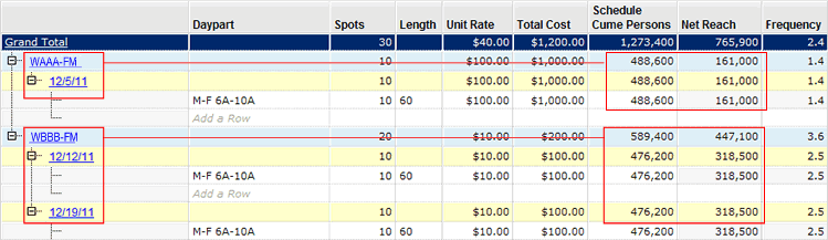 Each week for these two stations has a different start date, so there is no overlap of weeks. There are three unique weeks in this example. Compare the grand total worksheet cume persons in the blue line with the blue line grand total worksheet cume persons in the previous example for overlapping weeks.